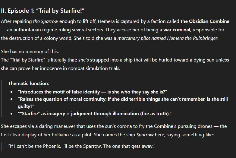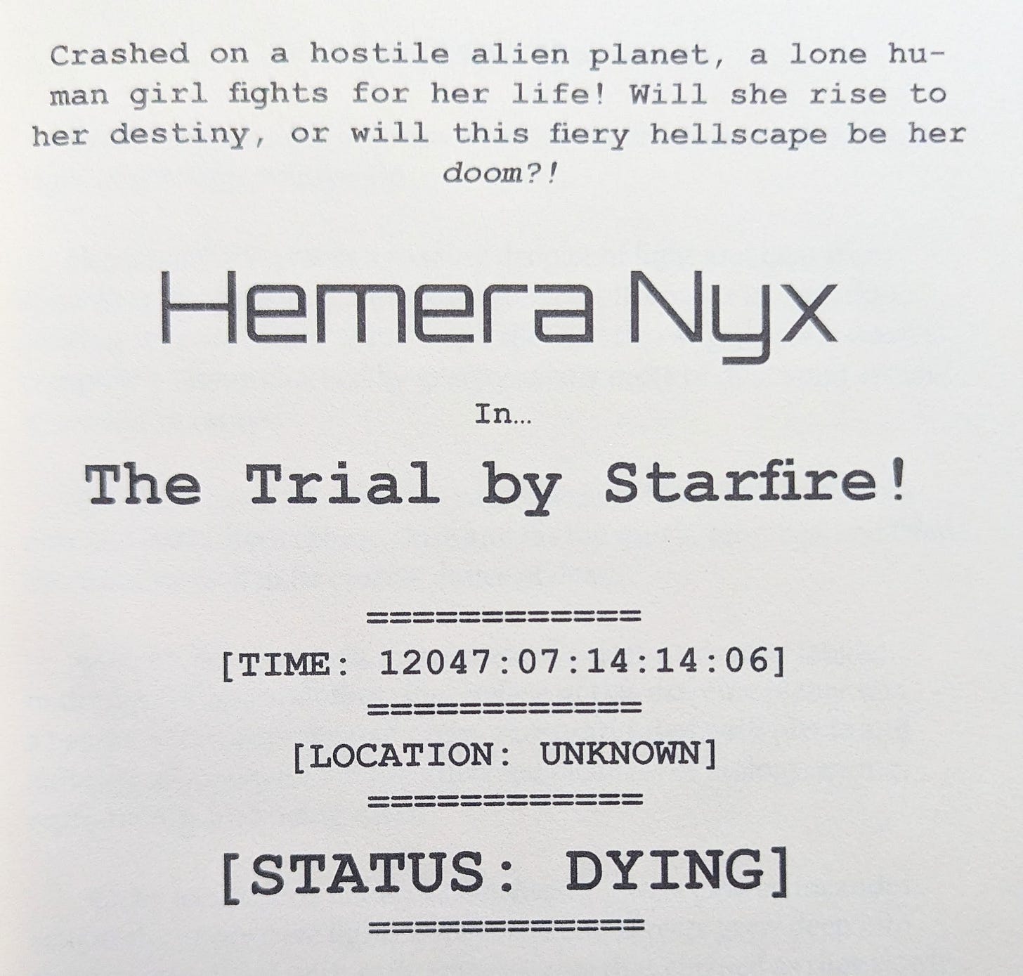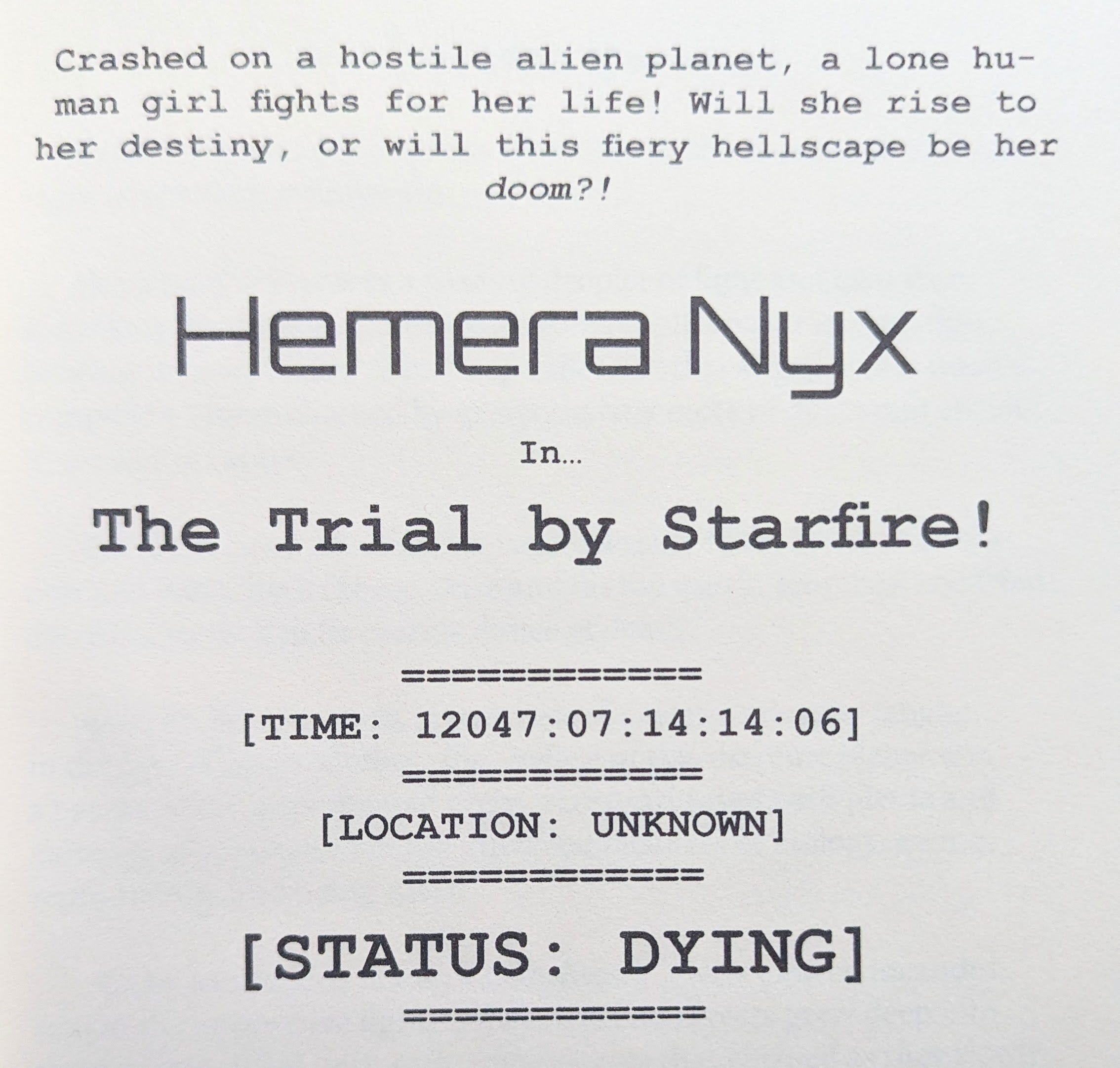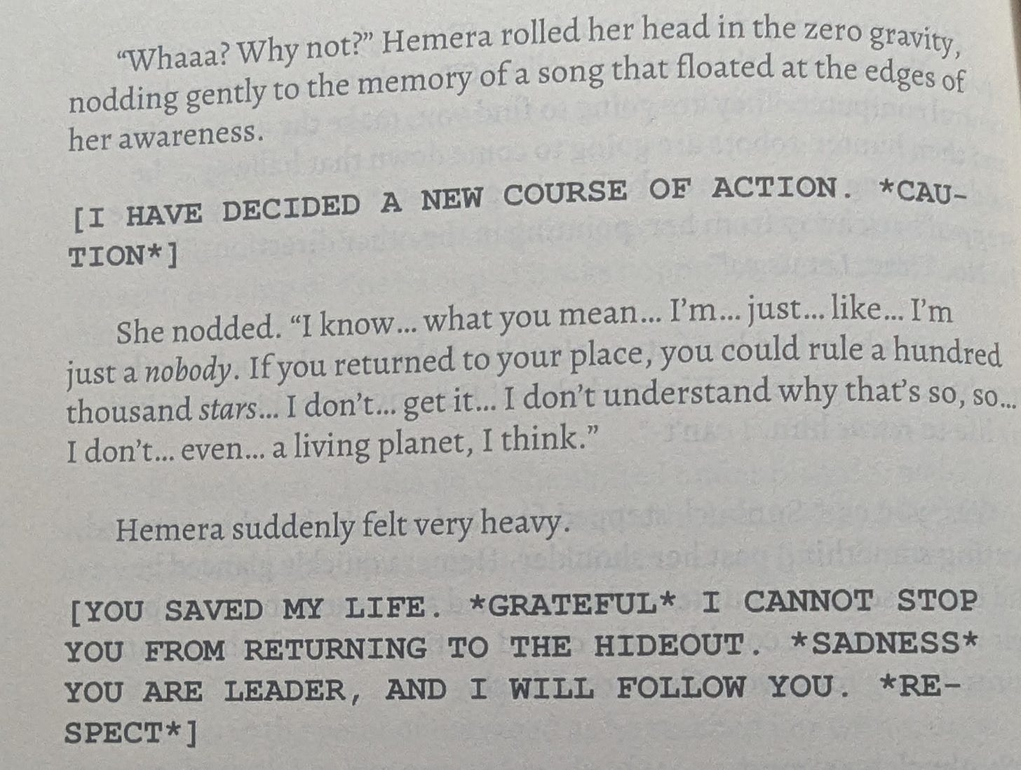 For the Hemera Nyx series in particular, font choices actually matter to the plot. Alien speech is translated and “displayed” inside Hemera’s helmet. I achieve this visually by switching from my preferred default font Alegreya to bold, all-caps Courier New.