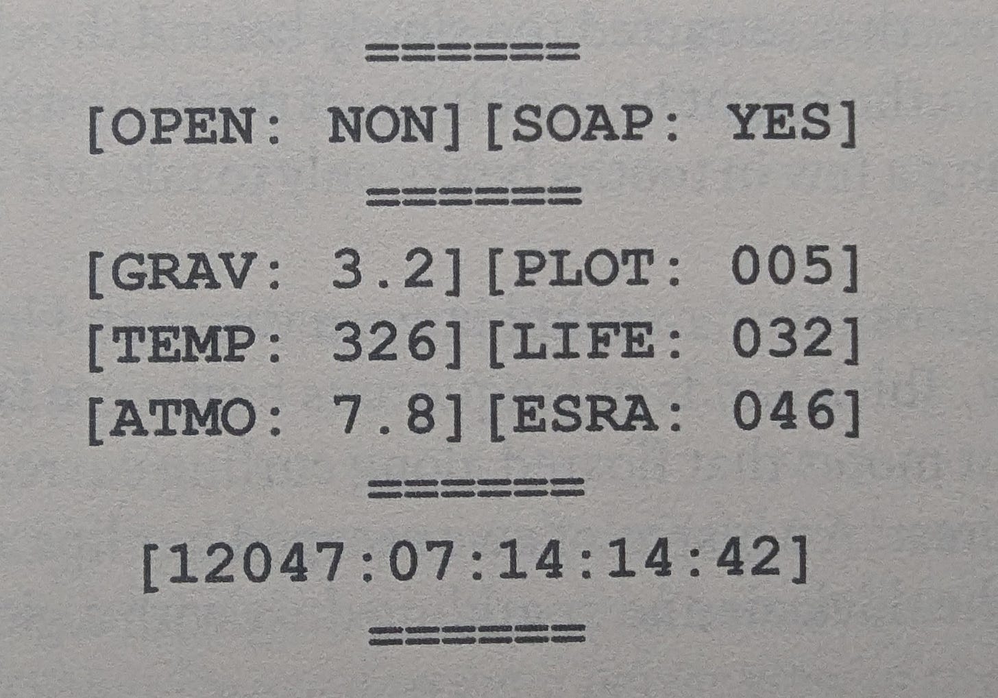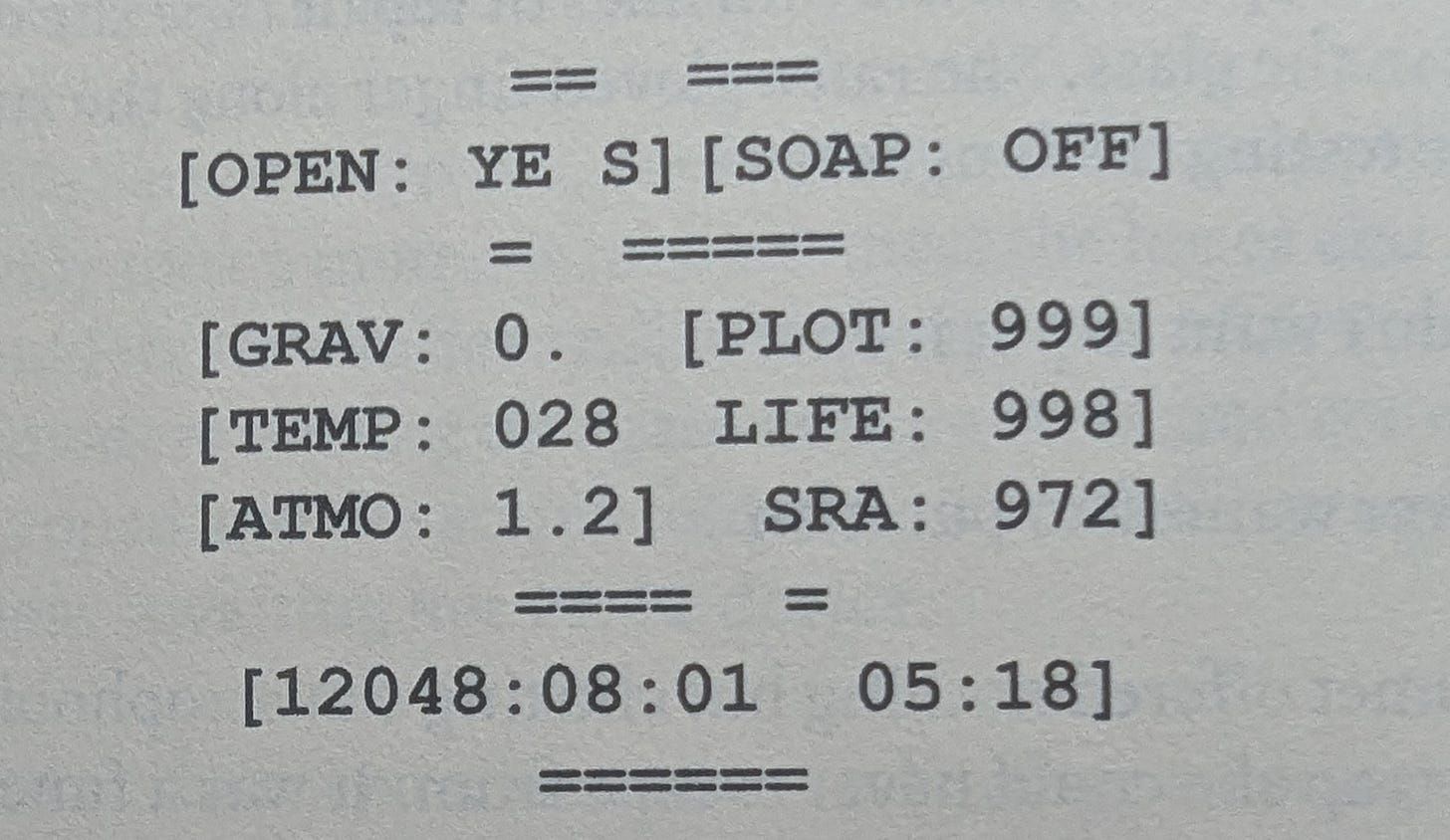 Additionally, Hemera has a display inside her helmet that contains environmental data. I use this as a subtle storytelling tool. If she’s exploring an alien planet, for example, I can adjust the values to imply that the rising temperature is a slow-building crisis, or that a sudden drop in atmospheric pressure foretells a massive storm is on the way. This formatting is only achievable with an evenly-space font like Courier. Any other font turns this into a garbled pile of nonsense.